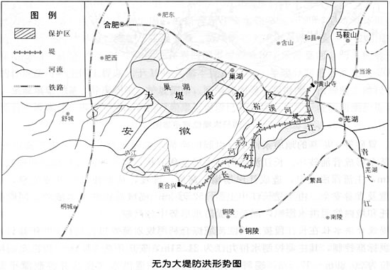 无为长江大堤位于长江下游北岸,自无为县西南绕而向东,上至土桥的果合兴,下至裕溪闸,全长125公里,为无为、和县、含山、庐江、舒城、肥东、肥西等七县,以及巢湖市、合肥市人民的生命财产和淮南铁路等交通干线的防洪屏障。