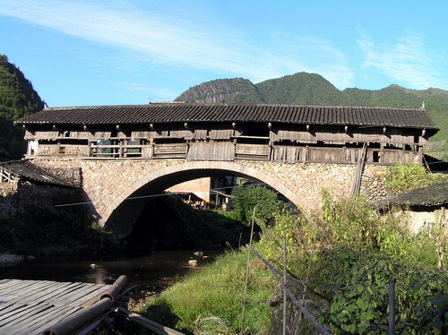 “由下溯上又见一桥,若飞若舞,……以其从州县来,故名来凤”,翻开吴懋修的《举溪记》,里面有这样一段文字。驻立在村头的来凤桥与如龙桥遥相呼应,是一座石拱廊桥,相传与如龙桥同等构造,后遭焚毁,现存建筑为清道光年间重建。桥身高出地面十余米,当地人又称为其“上桥”。在清澈的溪水映照下,桥拱与倒影在水面上形成一个全圆,虚实结实,互相衬映,水从桥洞缓缓流出,其意境之美正如桥上对联所描绘的:“水从碧玉怀中出,人在青莲瓣上行”。