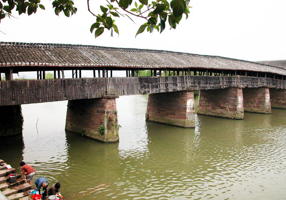 ????百梁桥古称“小溪江桥”,位于鄞州区洞桥镇百梁桥村,宁波十佳名桥。始建于北宋年间,距今已有925年的历史,横跨鄞江之上,是浙江省仅有的最长石礅木梁古廊桥,气势宏伟,结构完整,历史悠久,是研究古代桥梁的难得实例。被称为“浙东第一廊桥”。该桥全长77.4米,宽6.18米,六墩七孔,桥上建有瓦屋桥廊。因桥梁有124根大杉木架设而成,故曰“百梁桥”。