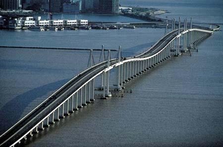 澳门镜海长虹——澳凼大桥,落成于1974年10月,连引桥全长3400多米,横跨澳凼海面,弧度很大,有如长虹卧波,设计独特,予人既雄伟又玲珑的印象,给古老的澳门平添现代气息。入夜后,桥灯吐亮,如珠连串,又给濠江夜空增添璨璀光彩。在不同季候,无论日夜,大桥都被烘托出秀丽的身影,成为澳门的风景线,也成为澳门发展的标志。1994年4月,第二道澳凼大桥(友谊大桥)建成启用,全长4414米,减轻旧大桥交通负荷,也对繁荣澳门起着重要作用。