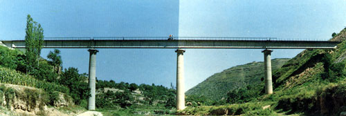 ?西延线狄家河桥位于陕西省境内,是西安至延安跨越狄家河的单线铁路桥,为4孔跨径40m的预应力混凝土连续梁桥。主梁为等截面单箱单室,梁高3m,系中国首次采用顶推法施工的连续梁桥。全梁分41块预制,除两端块外,其余块长均为4m,采用现场预制,分阶段胶接拼装。顶推采用水平-垂直千斤顶单点顶推,梁端设置30m长钢导梁。在顶推结束,钢绞线张拉、管道压浆后,全梁落在正式支座上。于1977年建成。