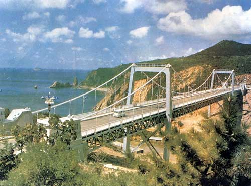 大连市北桥-东北地区桥 2024-03-28 08:47 桥梁文化 大连市北桥大连市北桥为3跨简支钢加劲桁梁的悬索桥,全长230m,桥面宽12m,索面距12.5m。桥塔为钢箱形截面的双层门式刚架,高35m。主缆断面呈六角形,矢跨比为1/10,锚碇采用重力式桥台。吊索距6m,采用直径45mm钢丝绳。跨中设斜拉索扣以增加刚度。1987年建成。 标签: 东北地区 大连市 北桥 评论留言 发表 全部评论 更多评论
