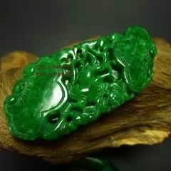 颜色浓绿悦目,色纯正不邪,硬玉结晶呈微细柱状、纤维状(变晶)集合体,晶粒肉眼能辩,透明度差,阳光照射不进,灯光约进表面lmm,质地粗粒感底干,敲击玉体音呈石声。