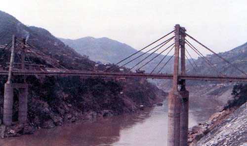 安康水电站跨越汉江,是安康水电站的一座专用桥。桥塔为钢筋混凝土斜柱式门架结构,塔墩为等截面双圆柱薄壁空心墩,左岸墩高47m,右岸墩高39m。拉索呈扇形布置,每边3对索。主梁为分离箱板组合结构。该桥下部结构采用滑升模板施工,上部结构采用悬臂拼装。1979年建成。