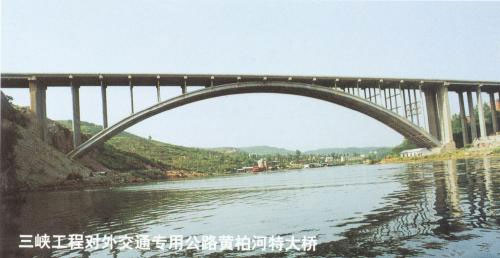由中铁大桥局承建。是长江三峡工程对外交通专用公路的重点工程。主跨采用净跨160m的上承式倒悬链线无铰钢管混凝土拱。桥长为276.71m。钢管拱架设采用“转体法”施工,转体重量达3600多吨。