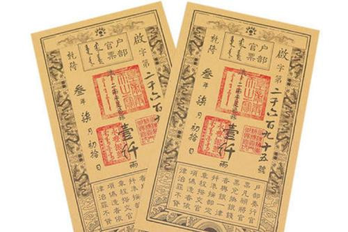 清朝末年,清王朝经济困难,国库空虚,为筹措军需费用,不得不一改长达二百年不印发银票的初衷,于咸丰三年(1853年)印制了清王朝建立以来的首种银票户部官票。此次发行的户部官票,以银两为单位,分一两、三两、五两、十两、五十两五种。票面正中上方用满、汉两种文字额书,户部官票;四字。中书,准二两平足色银壹两。票面下方有注文楷书;户部奏行官票凡愿将官票兑换银钱者与银一律并准按部定章程搭交官项伪造者依律治罪不货。户部官票的背面,在市场流通中依次签字花押。