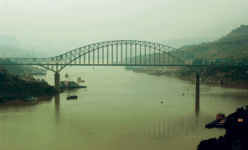 万州长江大桥2002.12-2005.12 全长1106.30m。主孔采用168.7m+360m+168.7m的三跨连续钢桁拱桥。两边跨为平弦桁梁,中跨主拱采用刚性拱柔性梁的钢桁拱。钢桁梁架设采用自行研制的BWQ35型变坡式架梁起重机架设,两岸引桥混凝土连续箱梁采用移动模架造桥机架设。由中铁大桥局设计施工。..