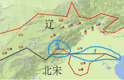 图3所示,公元1004年,北宋与辽国签订澶渊之盟,双方约定以白沟河为边界(图中1所展示的黑线)。合约中,辽国归还北宋莫州和瀛州,因此,幽云十六州其中有两州属于北宋,另外十四州则被辽国占有。涿州附近那块三角区域(图中2所圈的位置),这是北宋让给辽国的。
