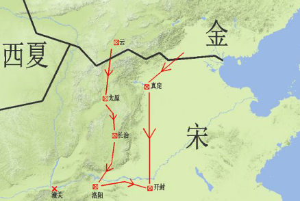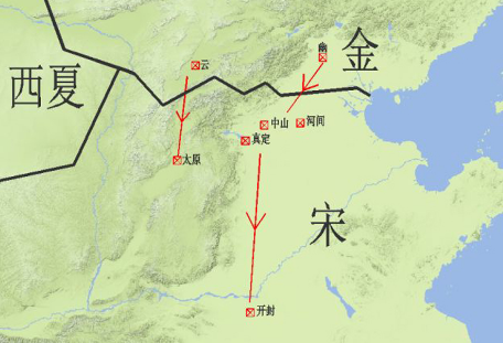 图5所示,这是金兵第一次南下,金兵兵分两路。一路从幽州出兵,先后攻克中山、真定等军事重镇,然后南下一马平川,直接兵临开封城下。另一路从大同出发,进攻太原,可是久战不下。于是兵分两路,一路继续围攻太原,另一路会师开封。宋金两军在开封城下达成和谈,金军撤兵北还,北宋割让中山、河间两个军事重镇。
