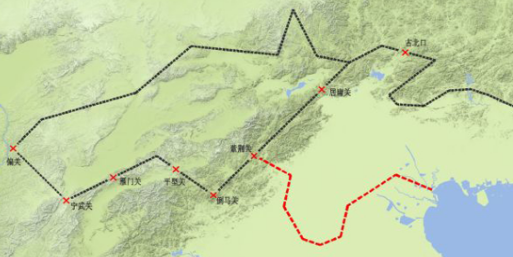 图7所示,黑色虚线就是长城的路线,幽云十六州之所以重要,是因为界线本身是长城的一部分,除了紫荆关到渤海这一段(图中红线),其他都与长城重叠。靠近居庸关的长城分成两段,北部叫外长城,南部叫内长城,南北长城所围的区域叫雁北地区。内长城在太行山脉设置了几个著名的关口,其中居庸关、紫荆关、倒马关合成为“内三关”,偏关、宁武关、雁门关合成“外三关”。