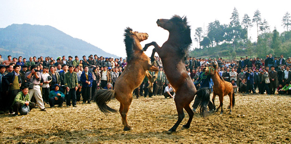 融水县西北部山区的安太、洞头、四荣、香粉、安陲等乡的苗民有斗马的传统。现在每年苗族的传统节日(如芦笙节、坡会、春社、新禾节等)都有斗马活动。斗马时,人们牵一匹雌马挑逗两匹公马,使之相斗。每次只斗一对。两匹公马在即将接近母马时,为了得到与之亲近的机会,各自昂头翘尾,高扬前蹄,厉声嘶呜,向对方扑去互相厮斗起来,或咬或踢,时而双双竖立,时而迅猛追逐,场面十分紧张激烈。有的要斗上几十个回合才分出胜负,败者退出,胜者留下继续迎战,最后以胜败场次的多少决出前三名。