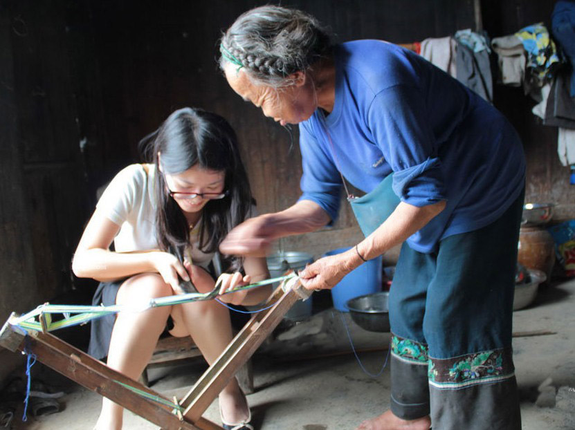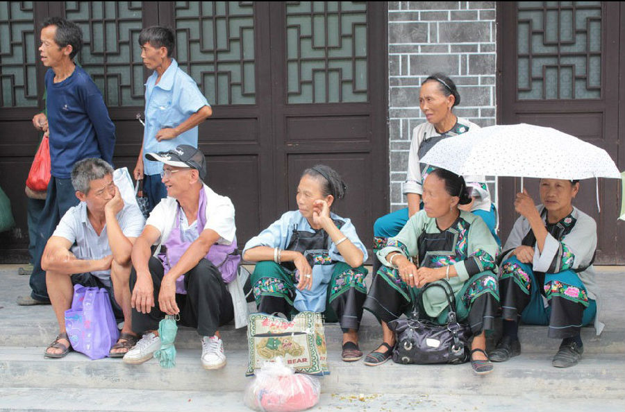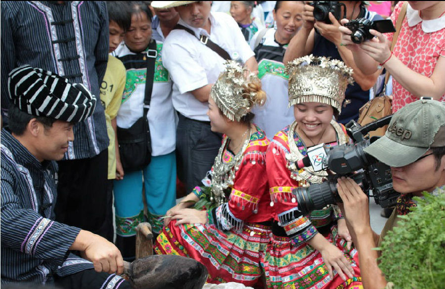 2、碰到几个电视台的记着采访两个穿着苗族传统服装的苗族小姑娘。好多人都停下来拍照。