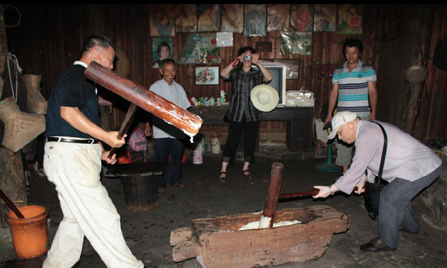 3、苗族的饮食很特别的,赶秋节前夕,苗族人民们打糍粑,主要用于祭祀祖先和招待宾客。下图为前来参加研讨会的学者与村民互动,村民家打糍粑。