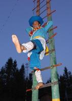 节日当天,会场中央竖着二三根二十米长的粗大竹竿,竿上插着三十多把刀刃朝上的长刀,称之“刀竿”,爬竿者头缠红布,身穿红衣,在绕竿歌舞