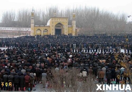 来自新疆各地的3万多名男性穆斯林在喀什市中国最大的艾提尕尔清真寺参加古尔邦节聚礼