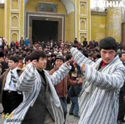 穆斯林群众在新疆喀什市的艾提尕尔广场跳起热情奔放的“撒满舞”,欢度古尔邦节。