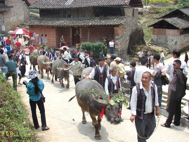 四月初八(农历)一早,早晨6点刚过,就举行了盛大的“祭牛王”活动。德高望重的布依族老人用猪头、鸡、酒、香纸祭拜牛王,为庆祝活动拉开了序幕。年轻漂亮的布依族姑娘和小伙身着盛装,热情的守候在寨门前,为前来参加活动的每一位客人献上精心酿制的美酒。