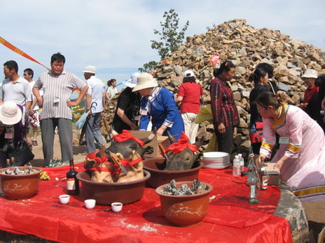 在这个达斡尔族一年一度最为隆重的民族节日里,人们清晨来到祭坛周围,就地取一块石头,摆放到祭坛旁边,如有因故不能前往者,可由家人或亲朋好友代放。早先,这是一种报到方式,属于族内清点人数的举动。斡包选定在水草肥美、林木茂盛的高地上,它堆得越高越大,预示着民族的紧密团结和兴旺发达。在斡包的中部顶端,插有松树或柳树枝,枝条上系有代表各部落的彩色布带。斡包西边的祭坛上,则摆放宰杀的牛羊头、各种食物和倒满的三杯酒。