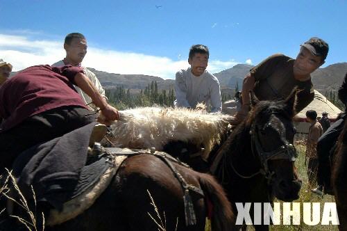 在新疆阿合奇县草原上,柯尔克孜族牧民在表演传统叼羊