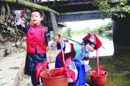 仫佬族的每年正月初一举行挑新水活动。新年的第一天早上,家庭主妇点上香和火把,挑着水桶到河边平时打水的地方,插上香,扔下几枚硬币,祭拜水神。之后,打水挑回家,让家人饮用一碗新水。据说,人喝了新水,可以子孙满堂。家畜喝了会体大身健。新年的第一天,如果谁挑上了第一桶新水,认为谁是最吉利的。