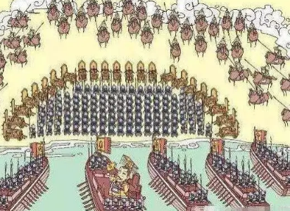 战船:用来控制水道、运送兵源和作战物资,一但战事不利,还可以接应阵中的晋军。