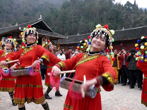 敬雀节上,仡佬族妇女表演“仡佬嘣嘣鼓”