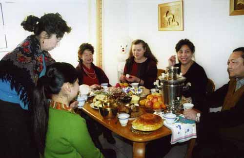 俄罗斯族人在各家准备的丰盛食品中,除各种各样的自制“比切尼”(糕点)外,还有一种必备食品——煮熟的彩色鸡蛋。鸡蛋的颜色有红、黄、蓝、白、橙、绿、紫等,摆放在大盘中,犹如一座五彩缤纷的花坛。据认为,它们象征着生命,象征着繁荣。拜访的客人一进屋,主人首先要送上一个彩蛋,表示祝贺。节日拜访中,主客双方有时还玩一种碰鸡蛋的游戏,也讲输赢,十分有趣。寒喧之后,请客人入席,主人要拿出丰盛的食品加以招待。有各种糕点、饮料,其中一种类似大蛋糕的塔式圆面包“古力察”,是由面粉加油、糖、鸡蛋、牛奶烤制而成,表面涂有着色的奶油和砂糖粒,晶莹、焦黄,松软可口。主人把它切成片请客人品尝,他们认为吃了这种面包会得到幸福。