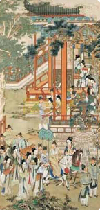画中,唐玄宗和杨贵妃骑马并行。在丝竹声里,公主们纷纷进献美食,据说一盘要花去十户中产人家的家产,十分奢侈。但玄宗却乐在其中。于是,鼎盛的唐朝渐渐出现危机。