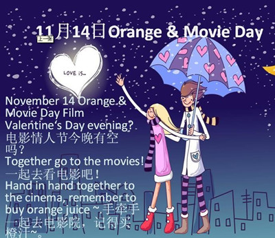 电影情人节的由来:11月14日是一个电影情人节,也是一个橙色情人节,这一天,很多人分开,也有很多人更加相爱。橙色情人节被定于11月14日,据说这是因为在这个橙色的季节里(植物变成红色或黄色),对于地球上的大多数人来说,最适合的休闲方式就是窝在电影院看上几场电影了。 而在发起地还流传这样的说法:过这一天最好的方式是,情侣们可以连赶两场电影,或许先看一部紧张刺激的动作片发泄压力,然后再来一部感人肺腑的浪漫爱情片互拭泪水。对于单身者,男女双方两个人都孤独寂寞或者两个中的一个人感到孤独寂寞,便可以在这一天名正言顺的找到自己心仪却不能走到一起,或者曾经相恋不幸分开,或者单相思、双相恋的那个人,陪伴自己去影院看一场期待很久亦或值得去回忆的电影,找到幻境中的感觉或者曾经一同看电影的感觉,电影结束即宣告约会的结束,没有晚餐,没有浪漫,有的可能是释然,也或是酸楚……