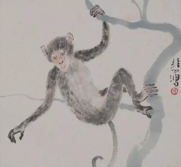 一九四五年冬,徐悲鸿在重庆盘溪沙平坝中国美术学院画下《十二生肖图册》,这是他生平唯一以十二生肖为题材的画作,也是海内外孤本。整套册页中动物造型准确,构图巧妙,设色淡雅。此图中,攀挂在树上的猴子用焦墨勾画,突出体毛的质感。