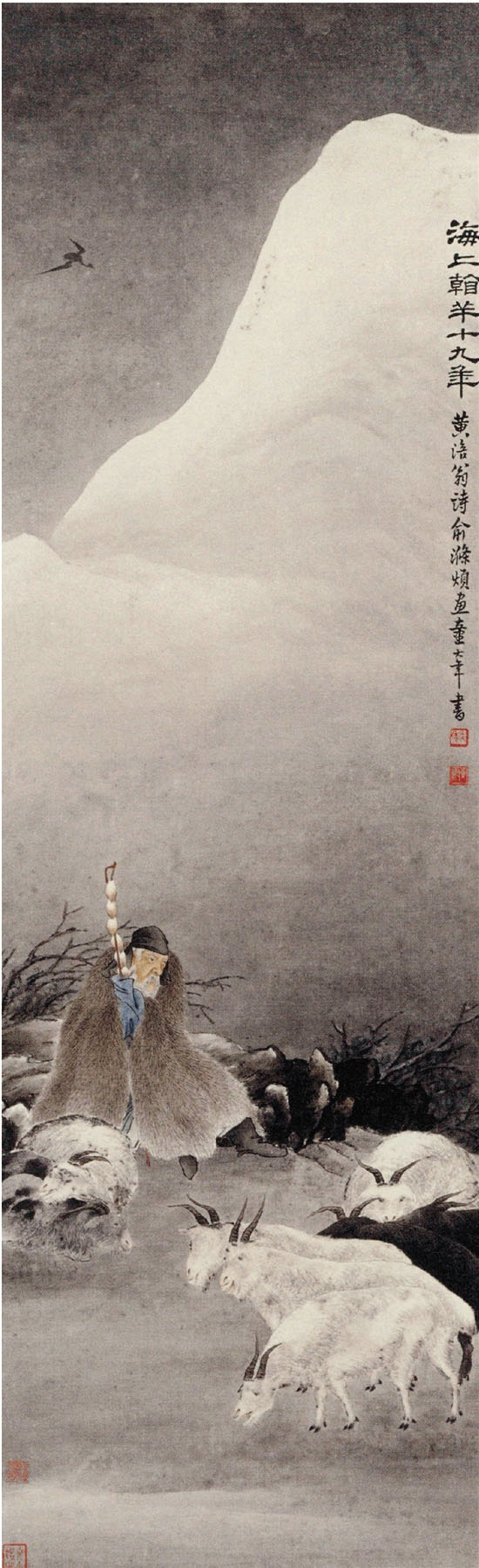 本幅描绘苏武留居匈奴十九载,历尽艰辛,持节不屈,终归国。羊,作为他生活中亲密的伙伴,也成为了重要的精神支扶。图中羊或望前方或抿嘴吃草状,都为悲凉静穆的气氛添加些许生机,些许盼望。