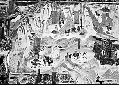 色彩绘画逐渐衰落并失去中心地位,水墨绘画不断发展壮大并成为主流,这是一个漫长的变化过程。山水画中天空水面由施染色彩到不施色彩,反映了时代审美风尚的转变。李白《观博平王志安少府山水粉图》一诗作于天宝三年(744年),敦煌莫高窟第217窟建于景龙年间(707—710年),是敦煌望族阴氏家族所建的功德窟。李白所见的那幅天空不设色的山水画、敦煌莫高窟的南壁经变画面,在色彩绘画盛行的当时非常罕见、别具一格,为山水画发展中的水墨之变提供了佐证,说明在初盛唐时期,水墨绘画已经开始滋长,水墨之变已经渐露端倪。