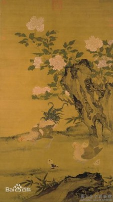 将,带领之意。雏,即幼鸟,在此画中指小鸡。《画花下将雏》展现了这样一幅场景:公鸡与母鸡带领着雏鸡在牡丹花下觅食,雏鸡或两两啄食草芥,或藏于母鸡翼下,活泼可爱,清新动人地体现了育幼之情。加之富贵牡丹、奇石、两三支青竹,既赏心悦目,又寓意美好。