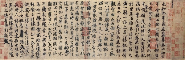 王羲之的《兰亭序》,南朝梁代的动乱中流落在外,到了陈朝天嘉年间(陈文帝年号,560——565)为僧人智永所得到。到了太建年间(陈宣帝年号,569—582),智永将它献给宣帝。后来隋平定陈朝,此帖又被献给晋王杨广,但杨广不甚看重。僧果(汲郡修武人,俗姓赵,名法祐)从杨广那里借去做拓片。后来杨广称帝,也不记得从僧果那里要回来。僧果去世后,弟子僧辩得到这幅法帖。唐太宗为为秦王时,见到此帖的拓本,十分惊喜。乃出高价购买王羲之手书的该帖,但始终没有得到。后来知道此帖在辩师处,便派萧翊到越州从辩才处求得此帖。该帖于高祖武德五年归秦王府。到了贞观十年(636),乃将拓本十本赐给近臣。太宗去世后,中书令褚遂良上奏,认为《兰亭集序》为太宗生前所看重,不可留在世间。于是秘密葬于昭陵。