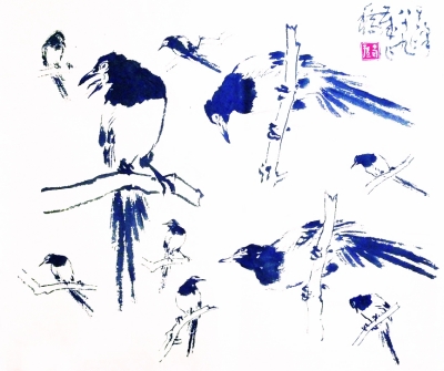?在这张喜鹊速写小稿上,我们就能看到先生用毛笔所描绘的喜鹊的各种姿态,或正面,或侧面,或仰视,或平视,或左顾,或右顾,或下视,或静或动,共有10种之多。先生说,平时多做这样的练习,到创作的时候就能随手拈来,自然如意。先生曾告诉我,原来他也只能画静态的禽鸟,不会画飞翔的禽鸟,后来觉得这是一种欠缺,就用了数年时间专门研究鸟类的飞翔姿态,并用笔墨加以表现,终于使自己笔下的鸟儿飞了起来。