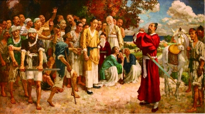 ?田横是齐国的后裔,汉高祖一统天下后,派人前来招降,田横让人取自己的头颅去见前来招降的汉高祖,这样既免去受降的屈辱,又保全了五百名士兵的性命。这幅油画描绘的就是田横与五百壮士诀别的场景。