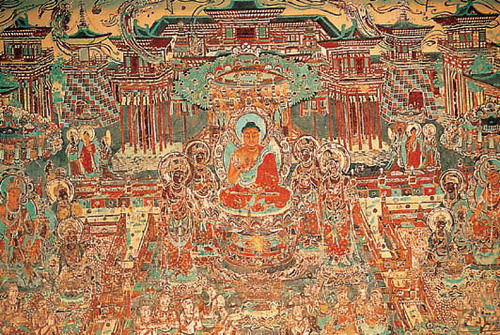 在净土变相中,把极乐世界装饰得非常庄严,其中有七宝楼台、香花伎乐、莲池树鸟,表现出无尽的美景。用富丽的物质现象,去描绘观想法门境界。其中表现了乐观美满的生活,并且所绘画的佛、菩萨、诸天、力士等,都是美丽与健康的化身。对于美和健康的赞赏,这和唐代的社会生活、人民的爱好是完全一致的。唐代的佛画中,并且点缀着许多人间社会生活小景,乐观、明朗、富有情趣,这些佛画可以说与世俗的情感愿望相结合。因此它深入到一般社会中,滋生在群众的心灵中,佛教艺术,得到了民间的拥护,为此后开拓了广大的园地,在中国绘画中,也扩大了它的影响。