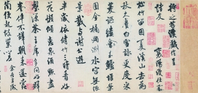 ?此卷为米氏著名代表作,反映了米芾中年书法作品的典型面貌。民国时出宫。1964年,故宫博物院从荣宝斋收购。收回时,残破不堪,经拼接后,仍损去一些字。经故宫专家重新装裱、补笔,基本恢复旧貌,很难看出接补的痕迹。此卷的装裱、修复成为故宫书画保护的一个经典案例。(本版文/图作者?李韵)