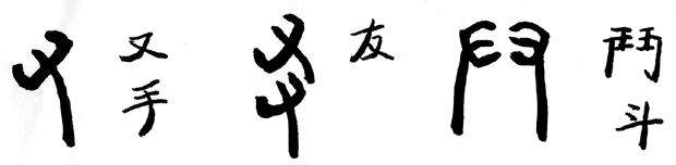 譬如“又”,是手的象形,两个手同向左,一上一下,则是朋友的“友”;如果两个人出手相对,则成了“鬥”(斗)。(原形如图)