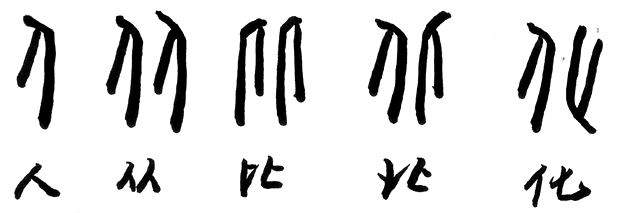 再如“人”,两个“人”同向左,则是“从”;同向右,则成了“比”;如一左一右,则成了“北”;如一正一反,就成了“化”。(原形如图)