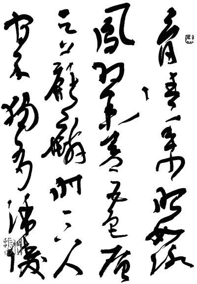?与此相对立的是一个“可能的世界”。刚才所说的那三点都是有可能做到的。例如,林散之在笔法这样一个已经被认为决不可能有创新的技法的情况下,带来了一种全新的“拖泥带水”的笔法。在草书的空间构成上,前人是以单字书写为基础,然后把单字连接而组成作品,但是今天的草书创作中已经开创了另一种空间结构:把单字中被分割的单位空间重新加以组织,从而形成草书空间的新局面。