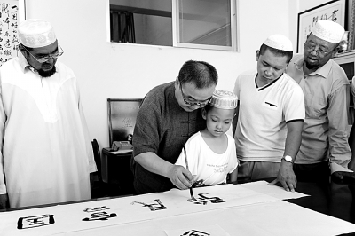 封俊虎在堡子清真寺辅导回族小朋友写毛笔字 赵广田摄