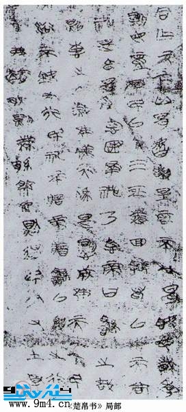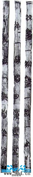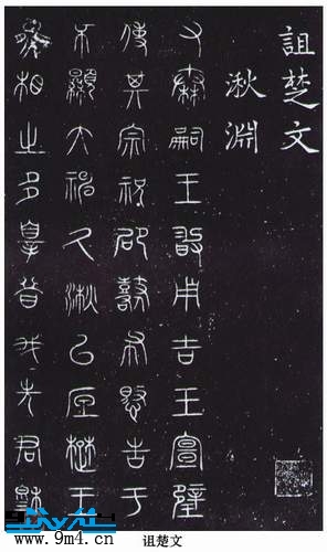 《诅楚文》,战国中期以后秦石刻,内容为秦王祀神制克楚兵复其边域,每告一神即刻一石。原石早佚,传宋代先后发现:㈠嘉祐年间凤翔开元寺出土的《巫咸文》,宋徽宗时取归御府,共三百二十六字。㈡治平中发现的《大沈久湫文》,共三百一十八字。㈢蔡挺所得,后藏洛阳刘忱家的《亚驼文》,共三百二十五字。原石宋时亡佚,所传拓本都系翻刻。现存摹刻在《绛帖》和《汝帖》上的是前两种,已失原形,不过骨架犹存,可以看出与小篆的渊源。
