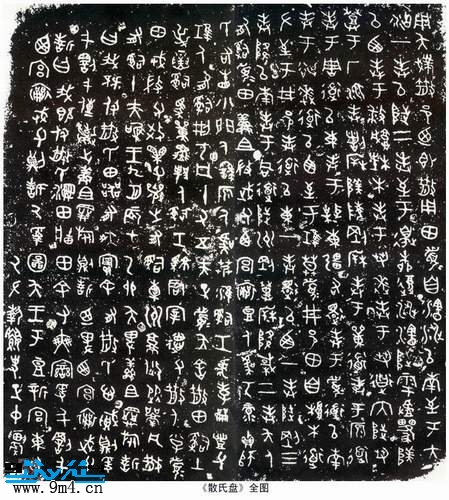 厉王时的《散氏盘》,也称《矢人盘》、《散氏鬲》,乾隆年间出土。盘腹有铭文十九行,满行十九字,计三百五十字。记述矢人将大片田地移付于散氏时所订契约,详载核定土田经界及盟誓经过,为研究西周土地制度的重要史料。其笔划一改典型金文的横平竖垂、匀稳工正,代之以欹侧斜正、粗细不一;字形取方扁之形,而且右肩似乎稍向下垂,与其它作品的长方或近方、端正稳重的体势不同,在金文中可谓别构一格。习篆籀者多取以为范。这种风格出现的原因,还有待于进一步探讨,但联系西周晚期的社会状况,不难发现,这种分化的趋势,应当是地域文化力量上升的必然反映。