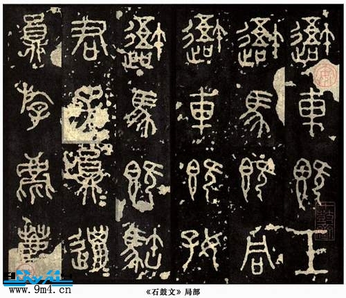 石上刻字,在我国出现甚早,商和西周已有石刻文字资料保存至今,但数量小,形制简单,不具典型意义。真正的石刻文字出现在春秋战国时期。随着冶铁技术的发达,铁器工具的使用,使刻石成为可能。具有书法艺术价值,足令后人称奇的石刻文字是《石鼓文》。