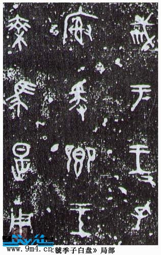 宣王时的《虢季子白盘铭》是西周晚期传世最大的青铜器,长方形,长一百三十点二厘米,宽八十二点七厘米,高四十一点三厘米。清道光年间出土于陕西宝鸡虢川司。铭文一百一十字。记述虢季子白奉周王命征伐西北强族有所虏获,受赏于周庙的事情。此盘字迹出于大篆而不尽相似,笔划纵向舒展,转折处圆劲,注意笔划之间的平行、等分关系,结体修长,上密下舒,章法散朗,全篇看去优雅清疏。论者以为实乃《石鼓文》之滥觞,由此而向小篆递进,顺理成章。近代攻篆者多取以为法。