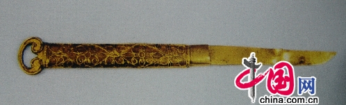 金掐丝菱形柄刀,唐,湖北安陆县唐墓出土