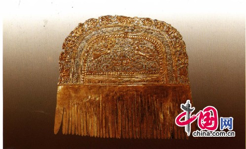 扬州三元路还出有一件金栉,栉是古代的梳头用具,也作首饰。这件金栉是用薄金片剪制镂刻而成,栉柄镂刻有繁密而精细的花纹,外缘为梅花和蜜蜂装饰纹带,往内为网纹带,中心部分刻有一对飞天,一人持拍板,一人吹笙。栉齿共有41根,均较长。此栉造型不太美,但纹饰极美。