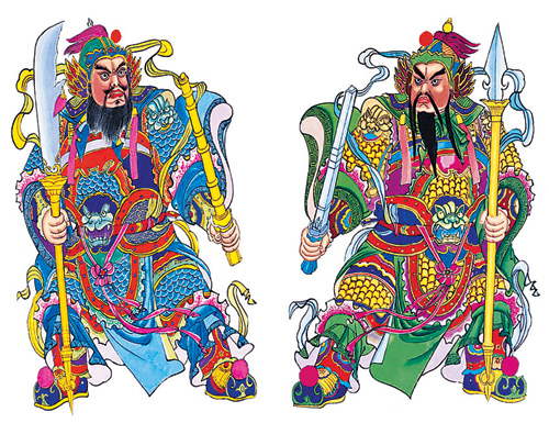 门神在中国民间受到普遍尊崇,新年撕下旧门神画像,贴上新门神画像成为中国人节令习俗。门神是中国民间贴在门上用于驱邪镇宅或迎祥纳吉的神像。据史书记载张贴门神的习俗最早出现于西汉,当时用的是神话人物的像,到了唐代因秦琼和尉迟敬德二位将军能镇鬼的故事传到民间,人们便尊他们为神,将他们的画像贴在门上。后来人们也将关羽、张飞等其他武将的画作为门神。也有张贴身穿朝服的天官一祈求平安吉庆的。中国民间张贴门神蕴含驱鬼镇邪、消灾去祸、祈福保平安之意。
