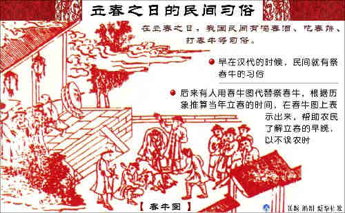 在“立春”这一天,举行纪念活动的历史悠久,至少在3000年前,就已经出现。当时,祭祀的句芒亦称芒神,是主管农事的春神。据文献记载,周朝迎接“立春”的仪式,大致如下:立春前三日,天子开始斋戒,到了立春日,亲率三公九卿诸侯大夫,到东方八里之郊迎春,祈求丰收。那么,为什么要到东郊去迎春呢?这是因为迎春活动祭拜的句芒神,居住在东方。后来,迎春活动的地点就不止是在东郊了。比如宋代的《梦粱录》中就记载,“立春日,宰臣以下,入朝称贺。”这就证明,迎春活动已经从郊野进入宫廷,成为官吏之间的互拜。